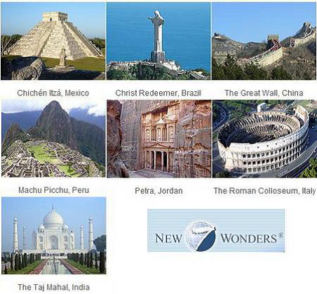 Il Colosseo, Il Taj Mahal, Il Complesso di Chichen Itza, La Città Perduta di Machu Picchu, Il Cristo Redentore, Il Sito Archeologico di Petra e La Grande Muraglia Cinese.