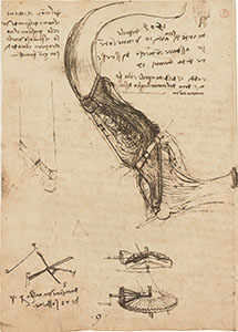 Codice sul volo degli uccelli, 18v. – Foglio con studio idrografico presso Firenze, note di vita quotidiana e prima formulazione della profezia del volo da Monte Ceceri: “1505 martedì sera addì 14 d’aprile venne Lorenzo a stare con meco disse essere d’età d’anni 17. E addì 15 del detto aprile ebbi fiorini 25 d’oro dal camarlingo di sancta Maria Nova. Del monte che tiene il nome del grande uccello piglierà il volo il famoso uccello ch’empierà il mondo di sua gran fama”, c. 1505.