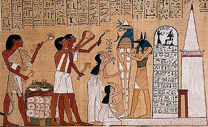 Nel antico rito dell'Apertura della bocca, Anubi, il dio dei morti dalla testa di sciacallo tiene la mummia che riceverà il ba,  il soffio dell'immortalità