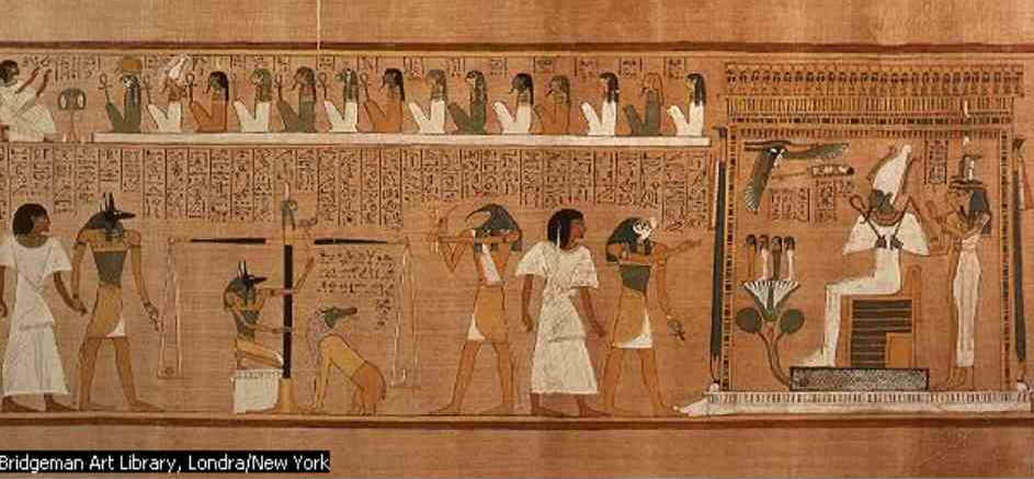 Illustrazione tratta da un Libro dei morti (1550-1090 a.C.), raccolta di incantesimi atti ad assicurare l’immortalità. Il defunto (a sinistra) segue Anubi verso la bilancia ove il suo cuore sarà pesato contro una piuma- simbolo di Maat, dea della giustizia e della verità- sotto il controllo del dio Thot: se colpevole, il suo cuore verrà divorato da un mostro (sotto la bilancia).