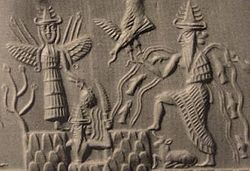 Il dio della saggezza Enki  (accadico Ea), tradizionalmente raffigurato con la barba lunga e flutti di acqua e di pesci che sgorgano dalle sue spalle mentre risale una montagna. Alla sua sinistra la dea alata  Inanna (sumero, babilonese Ishtar) in forma antropomorfa e con le ali.Parte di una impronta di sigillo cilindrico risalente al XXIII secolo a.C. conservato presso il  British Museum, Londra.