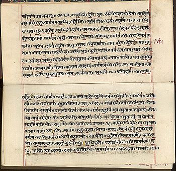 Ṛgveda. Manoscritto in devanāgarī, XIX secolo. Dopo una benedizione (“śrīgaṇéśāyanamaḥ ;; Aum(3) ;;”), la prima riga apre con il primo verso del primo inno del Ṛgveda (1.1.1): Agniṃ ; iḷe ; puraḥ-hitaṃ ; yajñasya ; devaṃ ; ṛtvijaṃ (Ad Agni rivolgo la mia preghiera, al sacerdote domestico, al divino officiante del sacrificio).