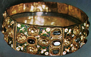 Secondo la ricostruzione, in origine le placche d’oro avevano soltanto la gemma centrale, come si vede in alcune monete che ritraggono Costantino con il suo elmo in testa. Due corone ritrovate nel XVIII secolo a Kazan, in Russia, sono del tutto simili; probabilmente anche la Corona Ferrea fu opera di orefici orientali.