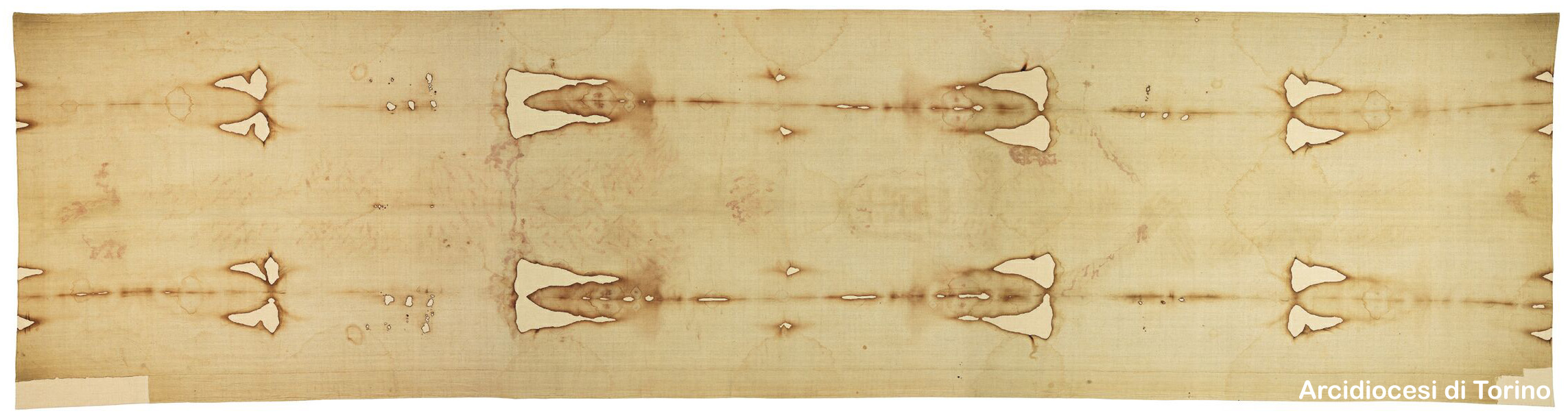 La parola “sindone”deriva dal termine greco sindon (tela di lino), che veniva usato nell’antichità per definire una porzione di panno destinato ad un determinato uso, ad esempio un lenzuolo. La Sindone, conservata a Torino da più di quattro secoli, è un grande pezzo di stoffa rettangolare, che misura 4,36 m di lunghezza e 1,10 m di larghezza. Il tessuto, consistente e robusto, è di lino puro di colore giallastro. Dal 1534 è cucito e impunturato su una tela bianca d’Olanda applicata come fodera di sostegno dopo l’incendio del 1532; quest’incendio provocò le bruciature che percorrono tutto il lenzuolo e sembrano incorniciare la doppia figura umana, frontale e dorsale, che vi si scorge.