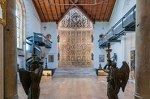 Dalla Galleria dorata si accede direttamente al grande studio dell’artista, utilizzato da Pogliaghi e dai suoi aiuti per lavorare alle imponenti commissioni che hanno caratterizzato la sua attività. Qui sono riuniti modellini e riproduzioni eseguite da Pogliaghi stesso delle sue opere più importanti. In particolare si segnalano gli Angeliporta-cero eseguiti per l’altare maggiore della Chiesa Primiziale di Pisa, un bozzetto per la Pietà della Cappella espiatoria di Monza, i Profeti per la Basilica del Santo a Padova, il gruppo della Concordia per l’Altare della Patria di Roma e alcune imposte bronzee per la porta centrale della Basilica di Santa Maria Maggiore a Roma. Domina la sala la maggiore commissione ricevuta da Pogliaghi che lo assorbirà completamente tra 1894 e 1908: la porta centrale del Duomo di Milano. Incorniciato dalla splendida scalinata in marmo di Candoglia, il modello in gesso in scala 1:1 sorprende e affascina il visitatore con la sua prorompente e scenografica teatralità. Le formelle in gesso – dopo aver subito il processo di fusione a cera persa per ottenere l’opera finale in bronzo – sono state assemblate, rilavorate, incerate e in parte colorate dall’artista per ottenere una personale riproduzione dell’opera. Così come il Duomo milanese, la porta è dedicata alla Madonna e propone sul battente di sinistra i misteri dolorosi della storia di Maria e su quello di destra i misteri gaudiosi. I due battenti sono sormontati da elemento fisso nel quale spicca l’incoronazione della Madonna assunta in cielo da Cristo tra angeli e santi significativi per la città di Milano.