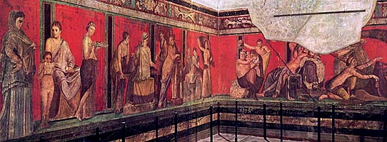 La Villa dei Misteri è forse l’edificio più noto ed ammirato di Pompei, e non senza motivo, sia perché è il più bello e completo esempio di una grande villa suburbana, sia perché i suoi vari ambienti sono decorati con pitture di alto livello artistico, in particolare la sala tricliniare ove è il grandioso fregio figurato che ha dato il nome alla villa. Lo scavo, iniziato nel 1909-10 e poi proseguito nei decenni successivi non è ancora completato, ma ne resta sotterra soltanto una piccola parte che si presume poco possa aggiungere a quanto già conosciamo. Il primo impianto della villa risale al II secolo avanti Cristo, e successivamente essa subì vari ampliamenti e rifacimenti: sorta come dimora signorile sullo schema dell’abitazione urbana ebbe il suo momento di splendore in età augustea ed in questo stesso periodo entrò a far parte del dominio imperiale. Dopo il terremoto dell’anno 62 decadde a villa rustica; gli ultimi suoi proprietari appartenevano alla famiglia degli Istacidi. E’ un grande edificio quadrilatero costruito sopra un terreno scosceso sicché in parte poggia sopra un terrapieno ed un criptoportico L’ingresso, non completamente messo in luce, si trova su di una strada di cui si conosce solo un breve tratto, e che forse era collegata con la Via delle Tombe. Ai lati dell’ingresso si sviluppa il quartiere rustico ed il quartiere servile con varie attrezzature come il pastificio, il forno, le cucine, la dispensa dei vini ed il torchio per la pigiatura dell’uva. Dall’ingresso, attraverso un piccolo atrio si giunge nel peristilio, e qui inizia il vero e proprio nucleo dell’abitazione signorile, con stanze e sale adibite a vario uso ed un gruppo di ambienti a destinazione termale. In questo quartiere signorile, in asse col peristilio è l’atrio maggiore, il tablino ed una veranda absidata con veduta sul mare. Ai lati sono ancora vari ambienti cubicoli, il triclinio del grande fregio, con portici di disimpegno tra i diversi gruppi di stanze. Attualmente è per l’appunto dalla veranda che si accede per visitare la villa, e questa parte dell’edificio possiede anche giardini pensili ed è sorretta dal criptoportico cui si è già accennato. La decorazione parietale dipinta è di disuguale interesse e rispecchia le diverse fasi della vita dell’edificio e le diverse destinazioni che esso ebbe. Meno interessanti sono le decorazioni di terzo e di quarto stile, ma degno di nota è il tablino, con pareti a fondo nero e motivi di tipo egittizzante, mentre di molto maggiore pregio sono i dipinti di secondo stile che furono risparmiati dai rimaneggiamenti che la villa ebbe nel suo ultimo periodo. Di tale stile è un cubicolo con figure connesse con il mito ed il culto di Dioniso, e questo cubicolo fa quasi da anticamera alla sala tricliniare. Il grande fregio della sala appartiene anch’esso al secondo stile e costituisce l’esempio più completo di un particolare tipo di decorazione che raramente s’incontra nella pittura di quell’epoca; abbiamo infatti qui una rappresentazione continua che occupa tutte le pareti della stanza, con figure a grandezza naturale o quasi. Secondo la più accettabile ipotesi il fregio deve essere stato eseguito verso la metà del 1 secolo avanti Cristo da un artista locale, che si è ispirato ad opere della pittura greca o che comunque di quella pittura e dei suoi canoni classici ha subito l’influenza. L’interpretazione del dipinto non trova concordi tutti gli studiosi, poiché esso non svolge un soggetto noto o facilmente identificabile, come ad esempio un mito, ma è formato di varie scene che si susseguono senza distinguersi l’una dall’altra e che sono certamente allusive a vari momenti di un rito del quale non possediamo altre testimonianze sicure. Di qui l’ipotesi che si tratti di uno dei culti misterici che convivevano nel mondo greco-romano accanto alla religione ufficiale e che erano noti soltanto a pochi eletti. E’ tuttavia opinione accettata dai più che il fregio rappresenti le varie fasi della iniziazione di una sposa ai misteri dionisiaci, misteri che ebbero diffusione anche nella Campania in età romana. Perciò vediamo che nelle varie scene si trovano figure umane alternate con figure della sfera divina. Il fatto che qui si sia voluto realizzare un tale ciclo pittorico può spiegarsi con la circostanza che in quel momento la signora della villa era una iniziata e ministra per l’appunto di quel culto. Considerando che il ciclo abbia inizio dalla parete nord, accanto alla porticina, nella prima scena è la lettura del rituale sacro, eseguita da un fanciullo sotto la guida di una matrona seduta, mentre una donna ammantata ascolta. Quindi il rito si svolge in una scena di sacrificio e di offerta e con un gruppo pastorale ove un Sileno suona la lira. La parete di fondo della sala è dominata dalle due divinità cui erano legati questi riti, Dioniso ed Arianna, con altre due scene: da un lato Sileni e satiri intenti ad una azione di oscuro significato, dall’altro una donna che scopre il simbolo della fecondità ed una figura alata in atto di percuotere col flagellum levato. Lungo l’altra parete una donna flagellata si rifugia nel grembo d’una sua compagna, ed appresso una baccante ignuda danza in preda all’esaltazione orgiastica. Infine la sposa si abbiglia portando a compimento il rito ed a chiusura del ciclo essa è rappresentata seduta e nobilmente ammantata, ormai iniziata e mistica sposa del dio.