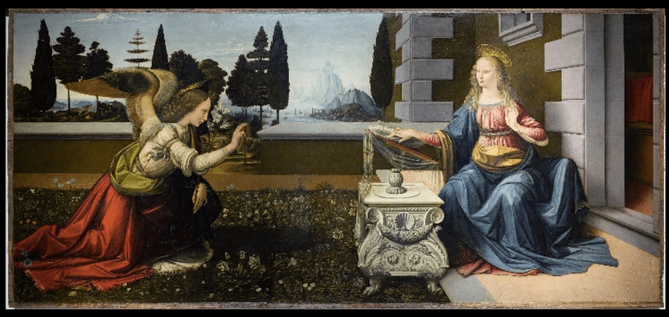 Foto 6 L’Annunciazione, olio e tempera su tavola (98×217 cm), è attribuita a Leonardo da Vinci e databile tra il 1472 e il 1475 circa. Si trova nella Galleria degli Uffizi a Firenze.