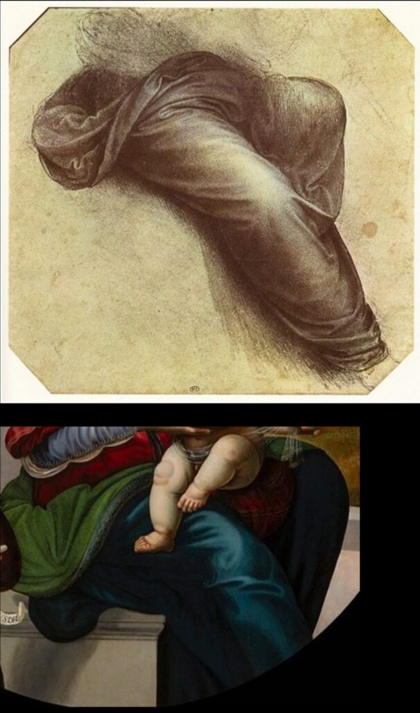 La forma e la caduta della manica evocano richiami stilistici con rappresentazioni pittoriche leonardesche. Gli studi sui panneggi per la Sant’Anna di Leonardo, conservati oggi al Louvre, svelano inequivocabilmente le fonti di ispirazione e la profondità del processo creativo di ispirazione creativa leonardesca del Ghirlandaio.