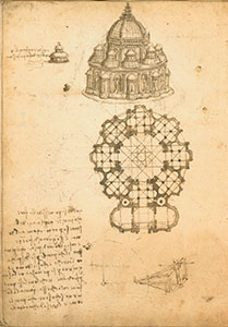 Codice Ashburnham 2037, 5v. – “Qui non si può né si debbe fare campanile, anzi debbe stare separato come ha il d[u]omo e’ San Giovanni di Firenze, e così il d[u]omo di Pisa, che mostra il campanile per sé dispiccato in circo, e così il d[u]omo”, c. 1487.