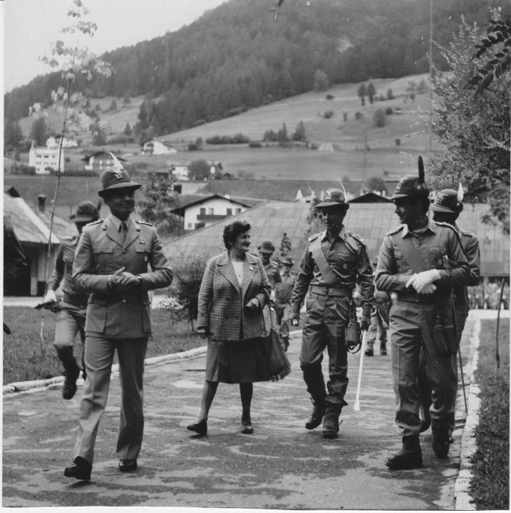 I momenti che più la riempivano di soddisfazione erano quelli delle sue ferie che in parte passava in qualche caserma degli alpini del Trentino o dell’ Alto Adige, in mezzo ai suoi ragazzi in divisa: i suoi Alpini. Infatti, in estate, era regolarmente invitata dagli alti comandi sia alle cerimonie del giuramento, sia a trascorrere le ferie con loro. Era alloggiata in caserma, in appositi locali preparati per lei; le veniva messo a disposizione un alpino che l’accompagnava ovunque volesse andare e colonnelli e generali la trattavano da loro pari, con un rispetto pari alla stima che di lei avevano, e la portavano nelle loro famiglie, invitandola ai vari avvenimenti come battesimi e matrimoni, trattandola appunto come una di famiglia. Tutto questo traspariva nelle serate passate a casa sua quando, come dicevo prima, ci presentava, attraverso le foto e gli scritti, gli ufficiali di tutti i gradi, dal sottotenente al generale, che erano onorati della sua amicizia, e le erano sinceramente affezionati. Tutto questo la appagava delle difficoltà di ogni giorno a cui comunque si era adattata.